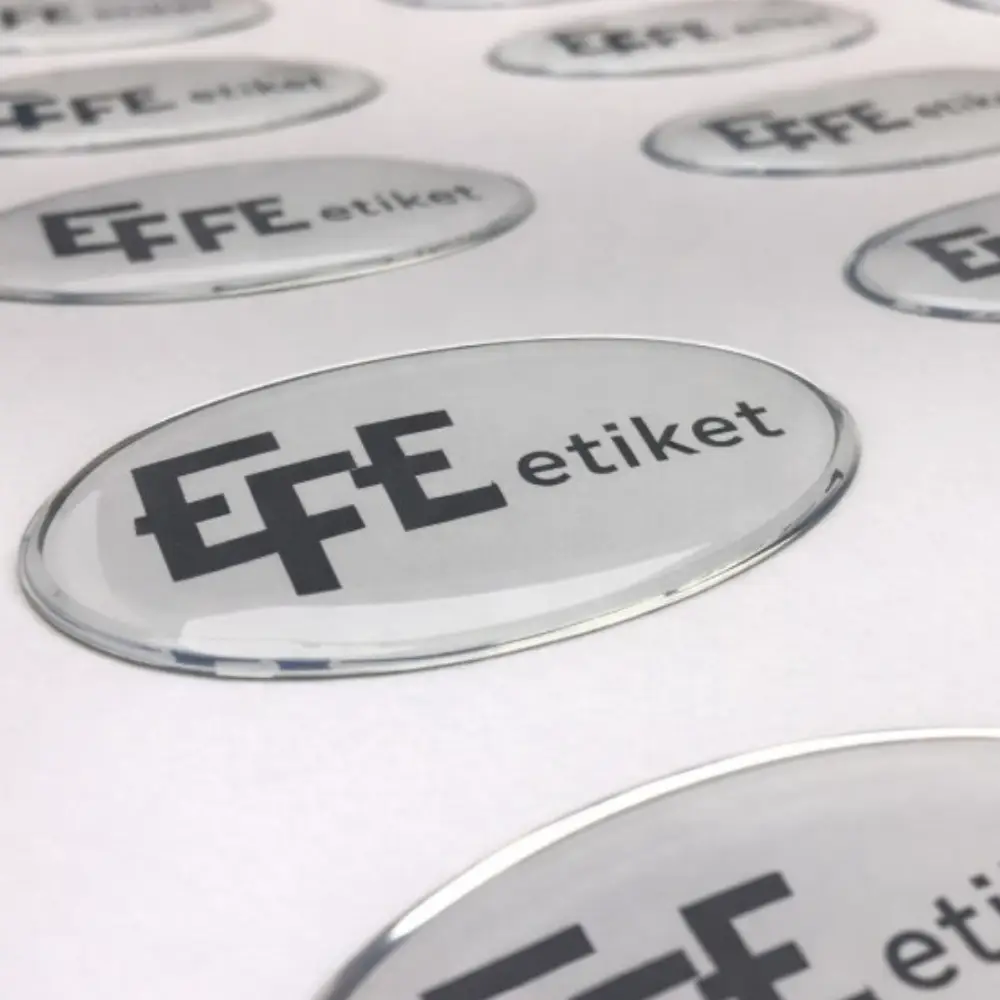 Marka etiketi, promosyon ve ürün kimliği uygulamaları için parlak, kabartmalı ve premium görünüm sunan damla etiket üretimi.